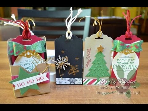 The box is made from a 6″ square of Kraft Cardstock. I used the envelope punch board to create it – the instructions are in the video. As for the tags, they are 2″ wide and anything goes! You really can sit down with just a few scraps and stamps, and come up with some great tags.