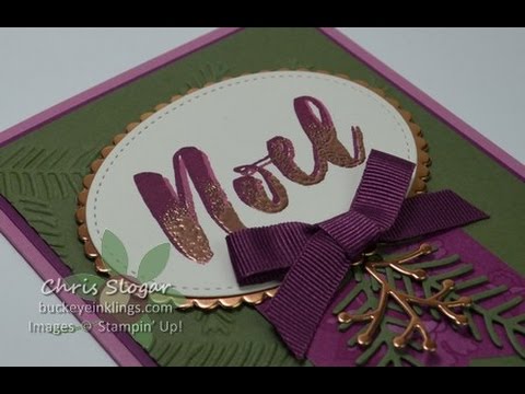 I love this technique that our CEO Sara Douglass shared with us at our convention earlier this month. The greeting is stamped with two colors, and the lower portion of it is heat embossed. I used Rich Razzleberry, Sweet Sugarplum and Copper Embossing Powder on the bold Noel greeting from “Christmas Pines”.