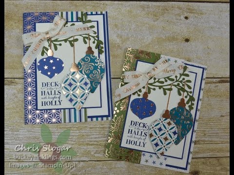 These are the designer paper version made with the Brightly Gleaming suite. This suite lives up to its name! I CASEd a layout that I saw on a card by Rachel Woollard for the panel of ornaments. The greenery is made with the Christmas Layers dies.