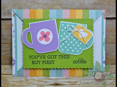 The front panel is made from the largest stitched, scalloped rectangle from the Stitched So Sweetly dies. The mugs are from the Sale-a-bration set Rise & Shine. This cheery paper is from the Coordination Product Release, and it is called Pleased as Punch.